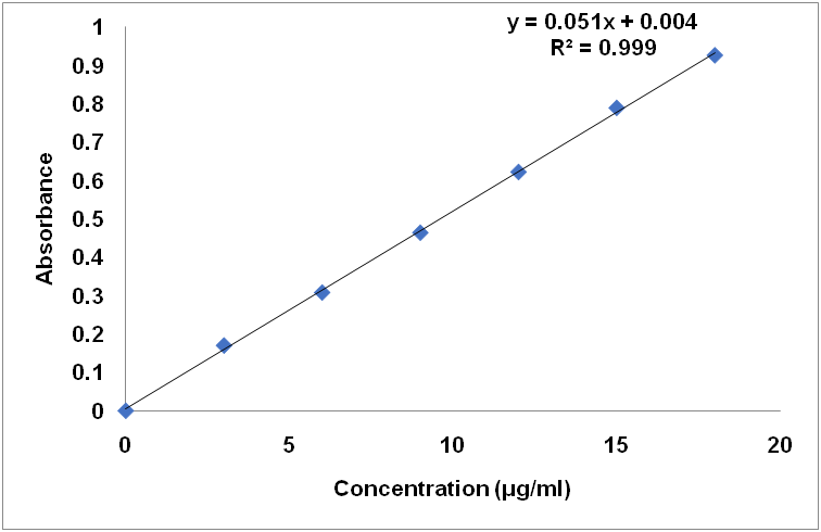 100 mg of amlodipine besylate was dissolved in 100 ml of 0.01N hydrochloric acid. 10 ml of this solution was further diluted to 100 ml of 0.01N hydrochloric acid to obtain 100 μg/ml From this solution (100 μg/ml) suitable working solutions of different concentrations of 3, 6, 9, 12, 15 and 18 μg/ml were prepared. The absorbance of these dilutions was measured at the determined lambda max of 237.5 nm. The standard graph of concentration versus absorbance was then plotted. Each point is an average of three determinations. Slope, y-intercept, and regression coefficients were calculated [9].