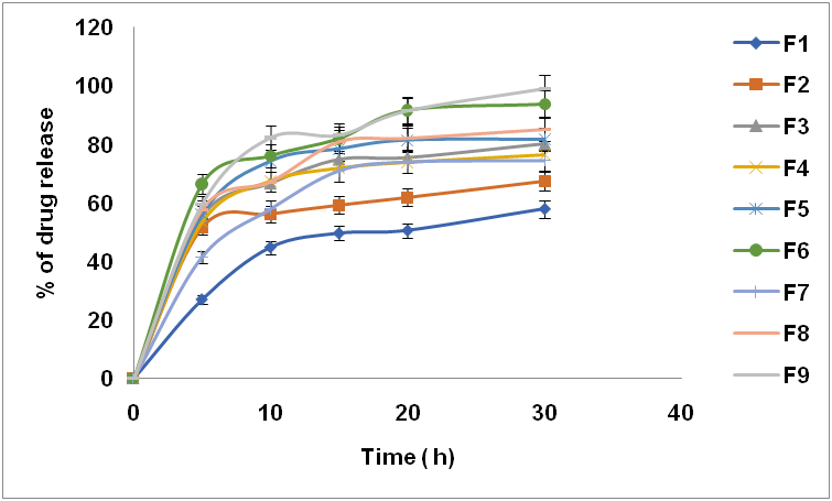 Fig. 2: Comparative in vitro dissolution profile of all the formulations (mean±SD, n=3)
