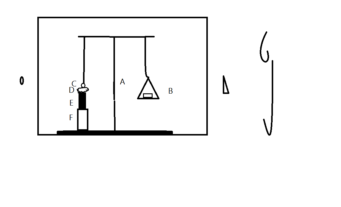 Fig.1: Schematic diagram of the device used for bioadhesion test (A) modified-balance (B) weight (C) rubber stopper (D) cornea with ocusert (E) glass vial (F) support to the vial to adjust weight