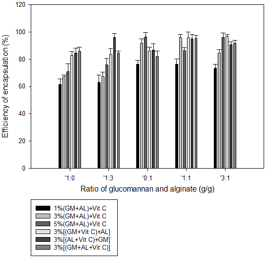 Conclusion: An equal ratio of glucomannan and alginate (1:1, g/g) which encapsulated 3% vitamin C showed the most efficient encapsulation as well as lower released vitamin C in pH 1.2 compared to that in pH 6.8. Higher efficiency was observed in encapsulating vitamin C using glucomannan which was coated with alginate.