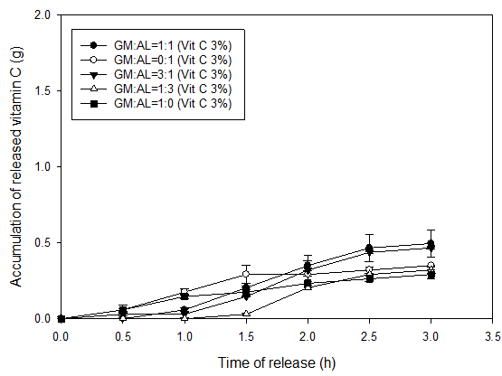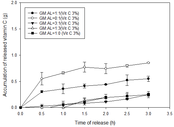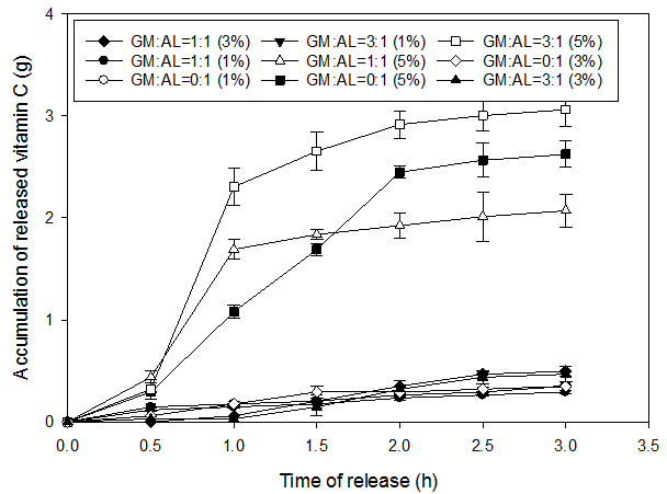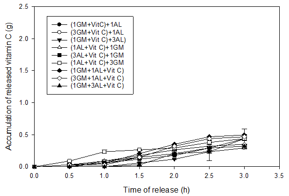 In this work, the encapsulation was applied to manage the release rate of vitamin C which controls by the pH of the simulated-digestion liquid. Fig. 3 shows the release rate of vitamin C from the matrix was faster in the intestine liquid-like than in the stomach, especially during the first two hour. The 1:1 (g/g) matrix of 3% vitamin C was the one that has a relative low release in both pHs. The use of a combination matrix could adversely affect to extend the period of the drug release profile. This combination allows forming the perfect interaction of glucomannan, alginate and vitamin C which mediated by hydrogen bonding to trap and control the release of vitamin C.