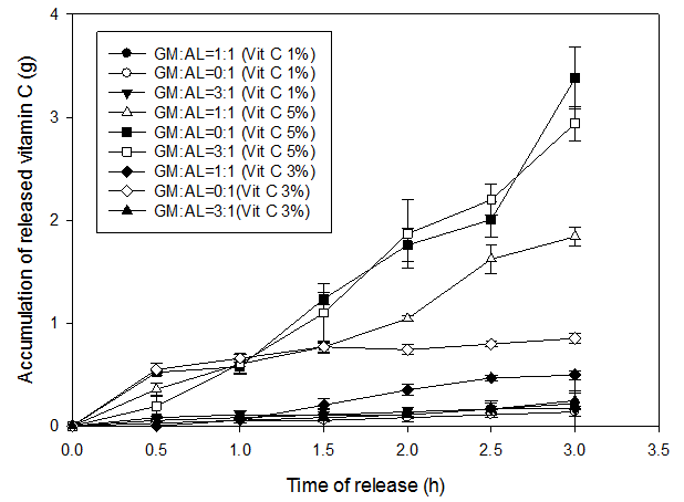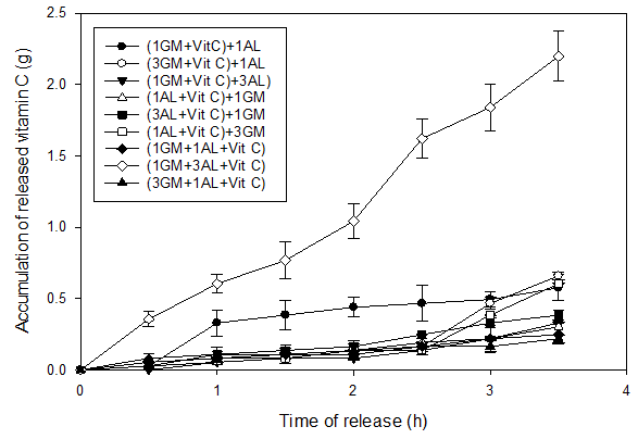 Another objective of this work was to maintain a low concentration of vitamin C existence in body liquid and less of the vitamin C excesses was discharged from the body. It was expected that the encapsulant protects the vitamin C from the digesting process in the stomach which has pH 1.2. Moreover, the encapsulant should be able to deliver vitamin C to the small intestine where the vitamin is absorbed via a sodium-dependent active transport mechanism. The absorption efficiency gradually decreases at higher intakes of vitamin C [4].