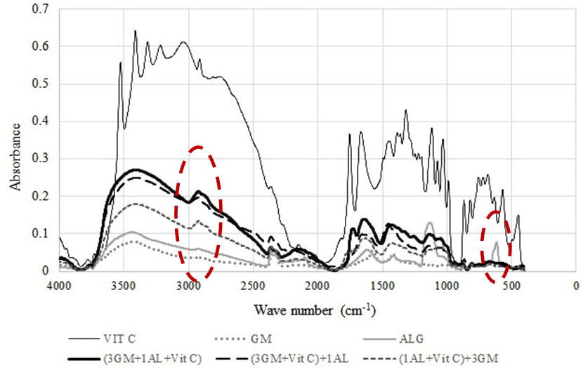 Both Chua et al. [26] and Huang et al. [28] reported a–CH2-stretching vibration at ~2900 cm-1 band was found in glucomannan and alginate. Interestingly, either lone glucomannan or lone alginate did not show a clear peak around ~2900 cm-1 which assigned to C-H group. This peak is observed only in the combination matrixes. The peak suggested that although each of glucomannan, alginate and vitamin C had unnoticeable absorbance of the stretching groups, this peak became stronger when these polysaccharides were combined.