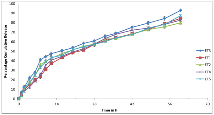 This showed that the formulations with increased concentrations of chitosan resulted in sustained release of the drug up to a certain level and furthermore decreased due to excess polymer concentration which resulted in high encapsulation of drug. Formulations ET1, ET 2, ET 4 and ET5) with varied polymer concentration, showed a constant increase and then decrease in the cumulative drug release due to drug degradation by the excess moisture content and uptake.