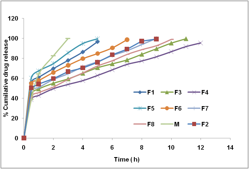 The in vitro drug release study of ciprofloxacin from all formulations was carried out by USP type II dissolution apparatus containing 900 ml of 0.1N HCl at 37±0.5⁰ C at 50 rpm for 12 h, and the result was shown in fig. 6. Dissolution data is represented in table 3. A significant decrease in the rate and extent of the drug release was observed with the increase in polymer concentration in in situ gelling preparation. The sodium alginate and HPMC with a primary role in the sol-gel phenomenon and buoyant also affected the release rate to some extent. F1, F2 and F3 released 96.5%, 99.3% and 99.5% in 5, 9 and 11 h of dissolution. Formulations F4 to F6 released 95.4%, 99.5% and 98.5% in 12, 5 and 7 h of dissolution. Formulations F7, F8 released 99.8%, 99.9% in 9 and 10 h of dissolution respectively. Commercially available product (M), CIFRAN showed 99.9% drug release in 4 h.