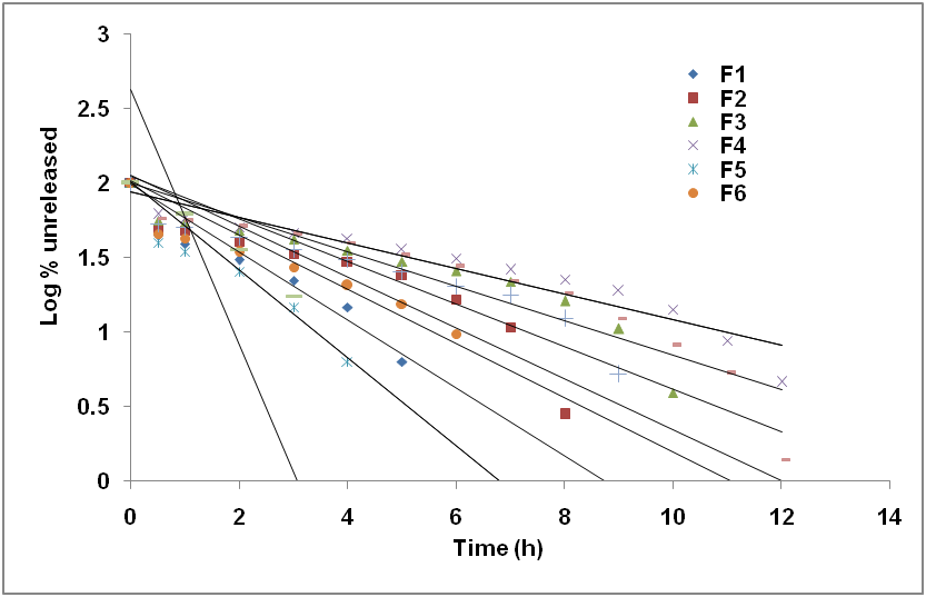 The cumulative amount of drug released from the systems at different time intervals was fitted to different kinetic models of zero order, first order, Higuchi model, Korsmeyer-Peppas model, and Hixson-Crowell model to find out the mechanism of drug release. The in vitro release profile was fitted to various kinetic models in order to find out the mechanism of drug release. The goodness of fit was evaluated using the correlation coefficient (r2) values. The correlation coefficient (r2) for all the formulations using different kinetics equation is listed in table 4. The values of r2 for all formulations were found higher for the first order model. It was found that all formulations mostly followed the first order models as the best fit model because of the higher value of r (correlation coefficient). The release profile of in situ gelling formulations was treated with Korsmeyer-Peppas equation, and slope value n≤0.45 were indicating fickian diffusion [19]. Kinetic profiles of various formulations were shown in fig. 5,6,7 and 8.