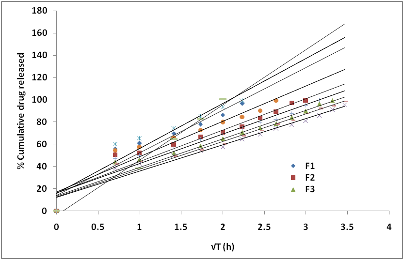Fig. 7: Higuchi plots of various formulations and marketed product