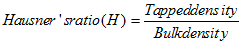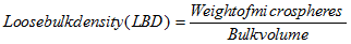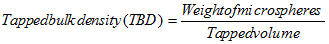A measured quantity of microspheres was introduced into 10 ml measuring cylinder, and the volume was noted. After that, it was tapped manually 100 times. Again the volume was noted. The loose and tapped bulk density was determined by using the following formulas: