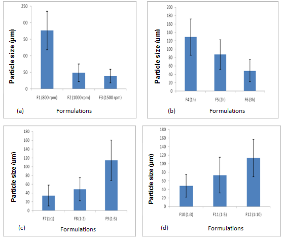 Fig. 1: Effect of (a) Stirring speed, (b) Evaporation time, (c) Drug/polymer ratio and (d) Aqueous/organic phase ratio on the particle size of the extract-loaded ethyl cellulose microspheres (data represent mean±SD, where n=3). SD = standard deviation