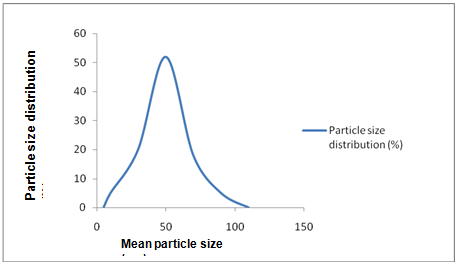 The particle size was determined by optical microscopy using eyepiece micrometer which was previously calibrated with the stage micrometer. The particle size was measured in the range of 34.25-176.25 µm among different formulations. The mean particle size of the microspheres significantly increased (34.25 to 114.75 µm) with an increase in polymer concentration. Higher polymer concentration with the fixed volume of organic solvent causes more viscous dispersion, leading to the formation of larger emulsion droplet and consequently larger particles. The viscous forces oppose the shear stresses in the organic phase, and the final particle size depends on the net shear stress available for droplet breakdown [21]. A critical parameter determining the particle size is diffusion of the organic solvent through the interface of emulsion droplet. For shorter evaporation time, the diffusion may not have been completed before the droplets start to harden, thus forming larger particles. But when the organic solvent is allowed to evaporate for a long time, the extent of diffusion will be greater, resulting in a smaller particle size. An increase in the particle size was observed with increased organic/aqueous phase ratio which may be explained by the change in viscosity of the emulsion formed during the process. Increased viscosity resulted in high viscous resistance against the sheer force during the microparticle formation. The external energy (in the form of stirring speed and amount of emulsifier) for droplet breakdown was kept constant. Thus, on increasing the aqueous phase volume, the same amount of energy must be distributed in large volume, causing less droplet breakdown and resulting larger particles. When the stirring rate was increased from 800 to 1500 rpm, the particle size was reduced rapidly (176.25-38.5 µm). This is because higher energy is released in the process that leads to the rapid breakdown of the emulsion droplets, resulting in smaller particle size [19]. The particle size distribution of the optimized formulation was shown in fig. 2.