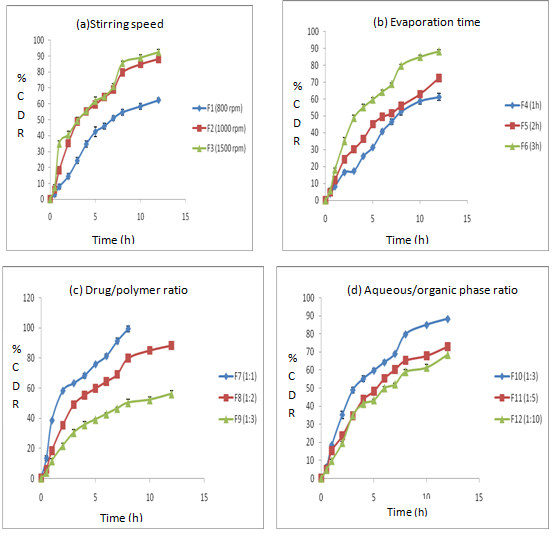 Fig. 3: Effect of (a) Stirring speed, (b) Evaporation time, (c) Drug/polymer ratio and (d) Aqueous/organic phase ratio on in vitro drug release of the extract-loaded ethyl cellulose microspheres (data represent mean±SD, where n=3). SD = standard deviation