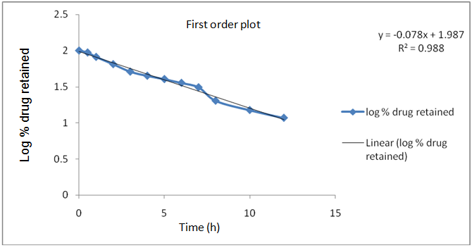 The dissolution data of the optimized formulation was analyzed according to various model dependent approaches (zero order, first order, Higuchi, and Korsmeyer-Peppas) and the mode of drug release from microspheres was calculated by plotting the curves. The kinetic model with the highest value of the coefficient of determination (R2) was considered to be a more suitable model for dissolution profile. In vitro release data follows first-order kinetics (R2=0.988) followed by Higuchi model (R2=0.978). Release mechanism was studied by Peppas equation. The value of slope (n) was calculated and found to be greater than 0.89 which indicates the mode of drug release is super case II type in which the erosion of the polymer takes place to release the drug content from the matrix. The first order plot of optimized formulation was shown in fig. 5.