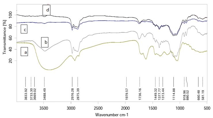 Fig. 6: FTIR spectra of (a) Extract, (b) Polymer (EC), (c) Empty microspheres and (d) Extract-loaded microspheres
