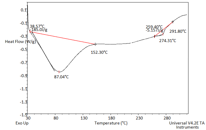 Thermal analysis of pure extract and extract-loaded formulation was performed with differential scanning calorimeter to determine the thermal properties of the drug and that of the formulation. The sample was placed into the aluminum container and heated in the range of 20-300 °C at a constant rate of 10 °C/min under nitrogen atmosphere.