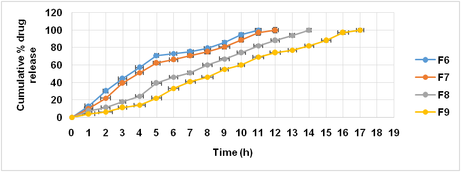 Ethylcellulose(EC) 5mp. a. s. was added to the formulation (F6-F9)release retardant polymer being insoluble in gastric pH. It was observed that floating lag time and total floatationtime is elevated for these formulationsbyincreasing concentration of ethylcellulose. This is due to ethylcellulose (EC)hydrophobicnature, so it canretardthe diffusion ofthe dissolution medium to the matrix,and this will delay the reaction betweenthe dissolution medium and NaHCO3(Sodium bicarbonate); thus, the generationof CO2 will be affected, and hence floatation time will be prolonged [35].
