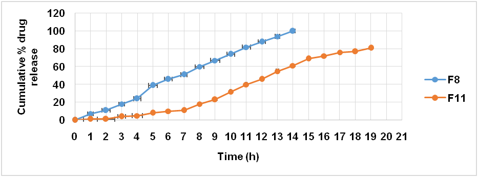 The release of amlodipine from formulations (F8 and F11) was studied to determine the effect of varioushydroxypropyl methylcellulose (HPMC) grades on dissolutionprofile and as showed in fig. 4. Thecumulativedrug release rate from hydroxypropyl methylcellulose (HPMC) K100M was significantly (p<0.05) lesser than hydroxypropyl methylcellulose (HPMC) E50. This is owing to decreases in the primary burst release which could be due to increase swelling of the high viscosity polymer with increasing amount; forming greater matrix integrity and longer diffusional path length; thus, less permeability of water. As perspective, the drug release rate was relying on the viscosity grade,and concentration of the polymers utilized [43].