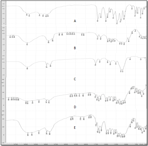 Fig.5: The FT-IR spectra for (A) pure amlodipine; (B) HPMC E50; (C) EC 5 mp. a.s; (D) Physical mixture; (E) Amlodipine floating tablet [F8]