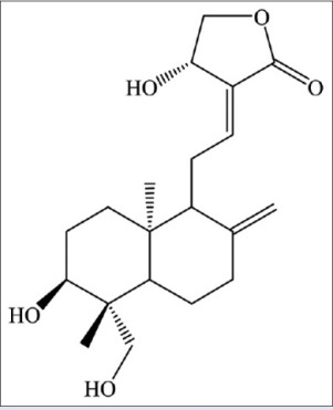 Andrographolide (fig. 1) is a diterpenoid substance isolated from the medicinal plant of Andrographis paniculata. This compound becomesthe point of interest since A. paniculata herb is widely used as a traditional medicine in several Asian countries such as India, Indonesia, China, Malaysia, and Thailand[1,2]. A large number of studieswere conducted to isolate, identify, and quantify this substance[3–5] as well as assess its pharmacological activities[6-8], and its safety[9,10].Andrographolide is reportedtoexhibit various biological activities, including antidiabetic[11], anticancer,anti-inflammatory[6], antivirus, and hepatoprotective activities. Despite the many pharmacological activities, it is reported that andrographolide has poor aqueous solubility and is extensively metabolized leading to its low oral bioavailability[2,12]. Hence, numerous studies wereperformed to develop andrographolidecontaining dosage form in order to enhance the acceptability, solubility, and bioavailability of this bioactive compound. Numerous dosage forms such as microcrystal[13], microemulsion[14], micelle [15], nanoparticle[16], solid lipid nanoparticle [17], spray-dried [18]and suspension [19]of andrographolide have been successfully developed.