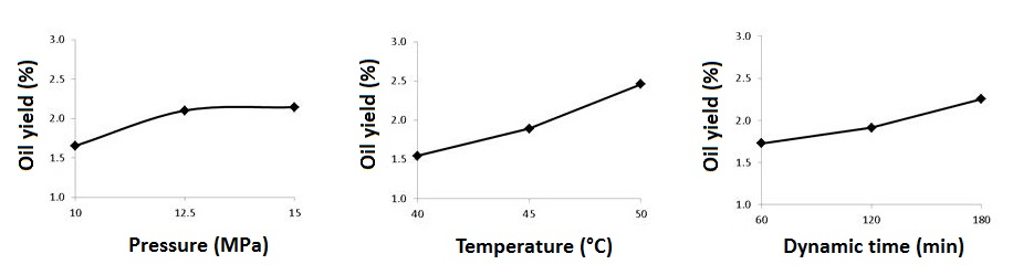 Methods:In order to determine the optimum extraction condition, a Taguchi experiment with L9 orthogonal array design was used. Effects of pressure, temperature and dynamic extraction time on citronella oil yield were investigated at levels ranging between 10-15 MPa, 35-45°C and 60-180 min, respectively.