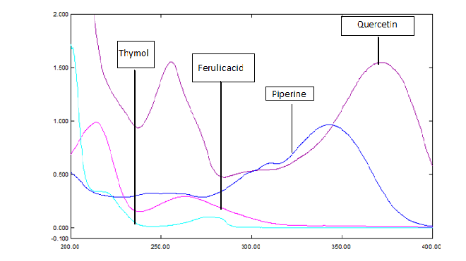 Fig. 1: UV overlain spectrum of quercetin, piperine, ferulic acid and thymol