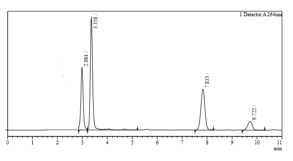 HPLC chromatographic separation was performed on a shimadzu liquid chromatographic system LC-2030 with pump P-5000, a fixed injector equipped 20 µl loop and UV-visible detector was used for chromatographic separation Lab solutions software was used for quantification of peak. Chromatographic separation was carried out at flow rate 1.0 ml/min using C18 column (shim pack GIST, 150 mm x4.6 mm, 5µ). The detection was carried out at 264 nm. The mobile phase consists of acetonitrile and buffer (potassium dihydrogen ortho phosphate, pH 3.0 adjusted with ortho phosphoric acid) in a ratio of 60:40 v/v. Ultrasonic bath was used for degassing mixing of the mobile phase. The mobile phase was filtered through a 0.45 µ membrane filter.