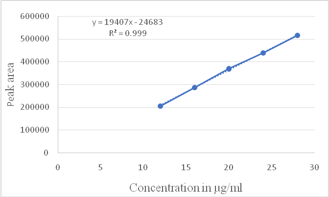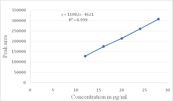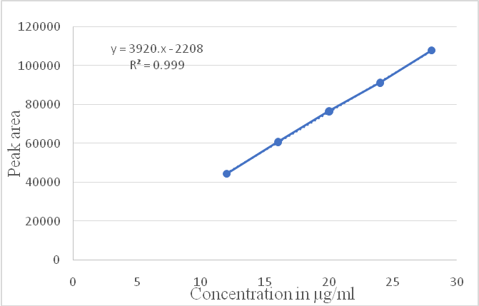The linearity of an analyte procedure is its ability to obtain test results which are directly proportional to the concentration of analyte in the sample. Linearity was evaluated by analyzing area under the curve as a function of analyte concentration. The result shows an excellent correlation between peak areas and concentration level within the tested concentration range of 12-28 µg/ml for ferulic acid, quercetin, piperine and thymol (table 5). The results were evaluated by calculating of regression coefficient (r2). The correlation coefficient was greater than 0.99 for each marker, which meet the method validation acceptance criteria [16, 17] and hence the method is said to be linear (fig. 3-6).