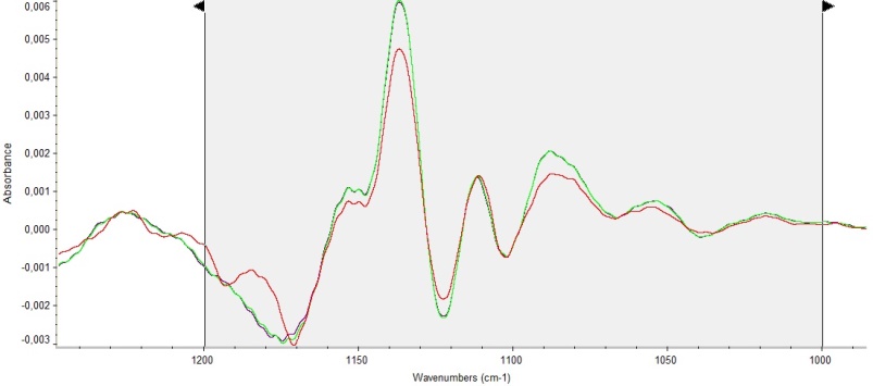 As it can be seen in table 2, the PCR model at wavenumbers region of 1200-1000 cm-1 using first derivative treatment (fig. 3) offered the highest R2 and the lowest results of RMSEC and RMSEP. These findings indicate that the PCR at 1.200-1.000 cm-1 with first derivative treatment was the most accurate among other developed models in this study. Fig. 3 shows the first derivative treatment to the spectra at 1.200-1.000 cm-1, this treatment removes baseline shifts and improves the accuracy of quantification [34].