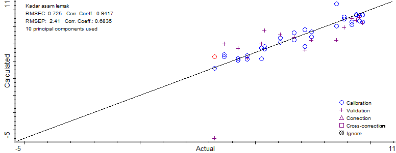The scatter plot in fig. 4 (a) showed the relationship between FFA actual and FFA calculated. The FFA actual in the x values obtained from the standard titration method, whereas the FFA calculated in y values given by the prediction model generated by FTIR using PCR model. The time required for FFA determination of sample by titration takes 10-20 min, while the time required for FFA determination uses FTIR in less than three minutes. This time comparison is in line with the previous research which stated that FTIR spectroscopy indeed not time-consuming. This method was also not laborious and an easy method. Besides, FTIR spectroscopy also reduced the number of chemical solvents usually used in the standard method for FFA determination, such as ethanol and sodium hydroxide.