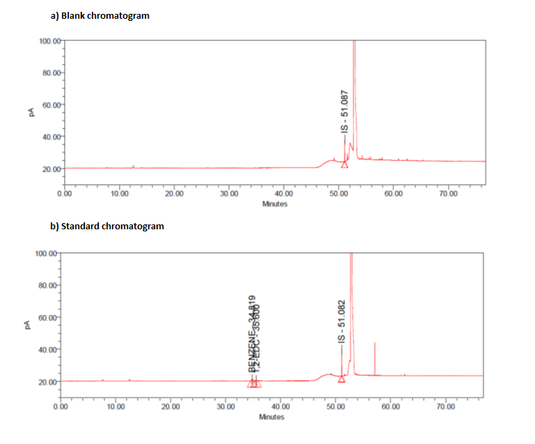 Methods: This GC-HS method was developed based on an oven-programmed approach using nitrogen gas as the mobile phase. Our method is also compatible with the GC-MS (gas chromatography-mass spectrometry) technique using helium as the mobile phase instead of nitrogen. The successful separation of benzene and 1,2-dichloroethane was established by confirmation of their corresponding specific molecular masses.
