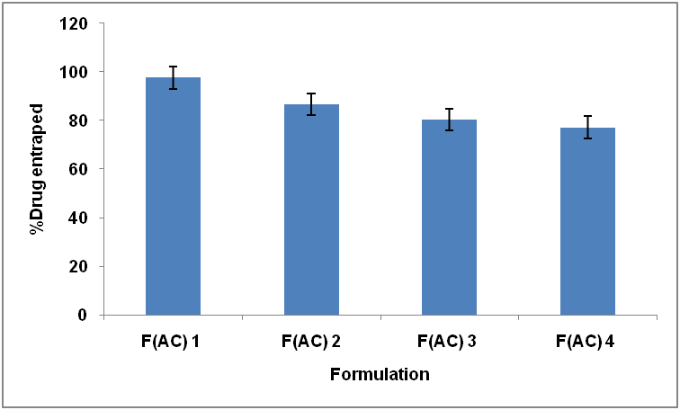 For a better pharmaceutical perspective, entrapment efficiency is a consequential parameter for collatingvarious proniosomal formulations.ACL is incorporated into the vesicles. The Formulation comprising span 60 exhibited highest entrapment efficiency over other spans, span 80 showed minimal entrapment efficiency. Observed variation with entrapment efficiencies of different surfactants is the consequence of diverse structure and length of alkyl chain used as surfactants [16]. The entrapment efficiencies of the respective formulation are presentedin(fig.1).