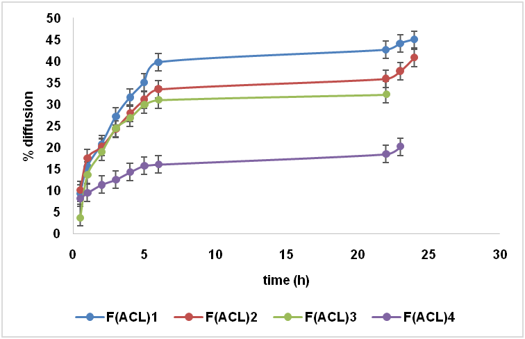 Amongst the different formulations, F(ACL)1 showed 45% drug release for 24h diffusion as shown (fig. 3). Consequently, formulation F(ACL)1 exhibited higher diffusion as compared to F(ACL)2-F(ACL)4 respectively.Commonly the release profiles of the proniosomal systems predominantly depended on hydrophobic lipophilic balance (HLB) value besides the alkyl chain length.