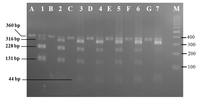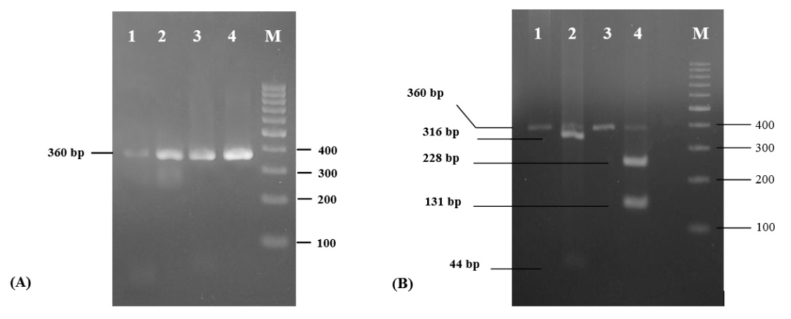 Based on in silico analysis and reports by Aida et al. (2005), Malik et al. (2016), and Murugaiahet al. (2009) [11,12,24] the appropriate restriction enzyme to discriminate cytochrome b DNAs of porcine and bovine is BsaJI enzyme. Correct DNA fragments, i.e. 316 bp+44 bp for bovine, and 228 bp+131 bp for porcine, can be observed on agarose gel after digestion at 60 °C for 2.5 h (fig. 1 B).