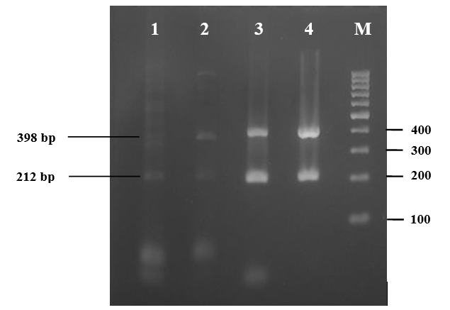 Fig.2:Agarose gel of duplex PCR of porcine and bovine DNA references using KAPA HiFi PCR Kit and KOD-Plus-Neo PCR Kit. Lane 1, bovine (KAPA HiFi); lane 2, bovine (KOD-Plus-Neo); lane 3, porcine (KAPA HiFi); lane 4 (KOD-Plus-Neo); lane M. 100 bp DNA ladder