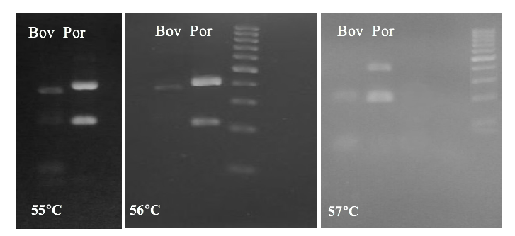 Fig.3:Agarose gel of duplex PCR on various annealing temperatures, i.e. 55 °C, 56 °C and 57 °C. Bov, for bovine, Por for porcine