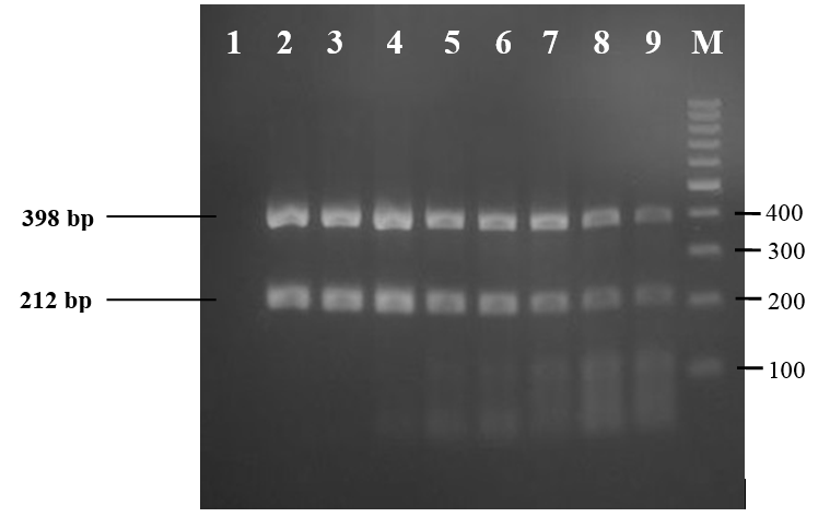 The result of annealing temperature optimization is shown in fig. 3. The optimal annealing temperature was obtained at temperature 56°C. This was concluded by the fact that employing bovine DNA reference amplification at 55 °C generated nonspecific band. Nonspecific bands may occur if the annealing temperature is too low, so the primer annealing becomes nonspecific to the site it should be. While in duplex PCR with annealing temperature at 57°C, there was a nonspecific band of 212 bp in bovine DNA reference amplification result. In addition, the 398 bpamplicon band often does not appear or look very faint on the porcine DNA reference. This means that annealing temperature at 57°C was too high thus the 398 bp primers were denatured before it could attach to the DNA template.