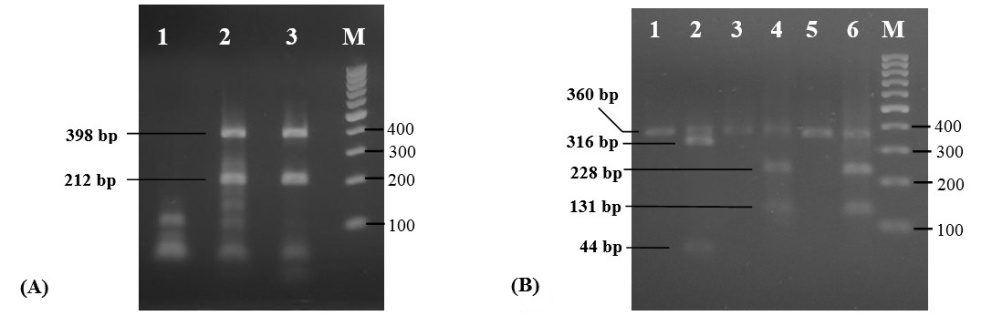 Fig.5:Agarose gel of DNAs from gelatin capsule shell samples. (A) Duplex PCR result: lane 1, capsule A; lane 2, capsule J; lane 3, capsule S. (B) PCR-RFLP result: lane 1, 3, and 5 are undigested capsule A, J, S, respectively; lane 2, 4, and 6 are digested capsule A, J, S, respectively. Lane M, 100 bp DNA ladder (Thermo Scientific, USA)