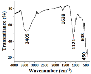 Synthesized zinc oxide nanoparticles were subjected to FTIR spectral study to identify various functional groupsrelatedto the prepared nanoparticle. FTIR spectrum of synthesized zinc oxide nanoparticles was shown in fig. 2. The Peaks at 450 [34] and 603 are assigned to the Zn-O stretching vibration [8].The peak at 1121 indicates the triply degenerative vibrational mode of sulphate ion.The peaks at 1638 and 3405 are assigned to the bending and stretching vibration mode of water molecule.
