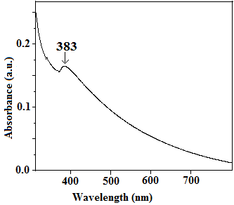 UV-Visible spectroscopy is most widely used technique to investigate the optical properties of the particles.UV-Visible spectroscopy analysis was done in the range of 200-800 nm.Zinc oxide nanoparticles typically exhibit optical absorption around 370 nm [35-36]. The optical absorbance spectra of zinc oxide nanopowder showed in fig. 3.The band was observed at 383 nm assigned to the absorption of zinc oxide nanoparticles.