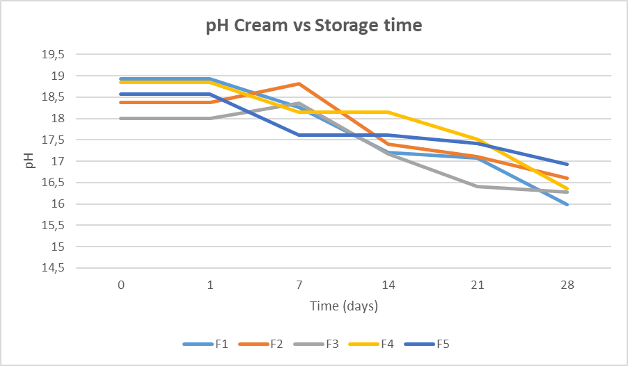 It was found that the formula did not experience physical changes in color and odor for 28 d of storage time. But there was a change in the consistency of the cream. Changes appear in F-1 and F-2, while F-3, F-4, and F-5 did not experience changes in consistency. The change in consistency in F-1 occurred on the 14th day, which was a change in consistency from thick to thick easily flowing. While the change in consistency in F-2 occurred on day 21, which was a change in consistency from thick with a higher viscosity quantity to thick, but even so, overall physical/organoleptic stability could be said to be quite reasonable.