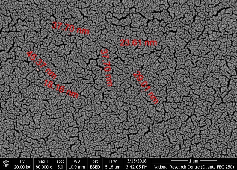 Fig. 1 reveals the distribution of PLGA-NPs within the porous channels of HG matrix. SEM image shows the nanosized dimensions of PLGA-NPs.