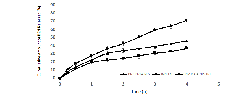 Fig. 2: Drug release profile of BZN from HG, PLGA-NPs and PLGA-NPs-HG (Results are expressed as mean±SE, n=3)
