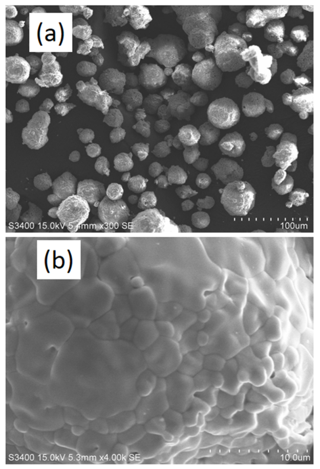 Fig. 2: SEM images of as-prepared zinc oxide nanoparticles using parthenium extract at different magnitudes (a) 100 m and (b) 10 µm