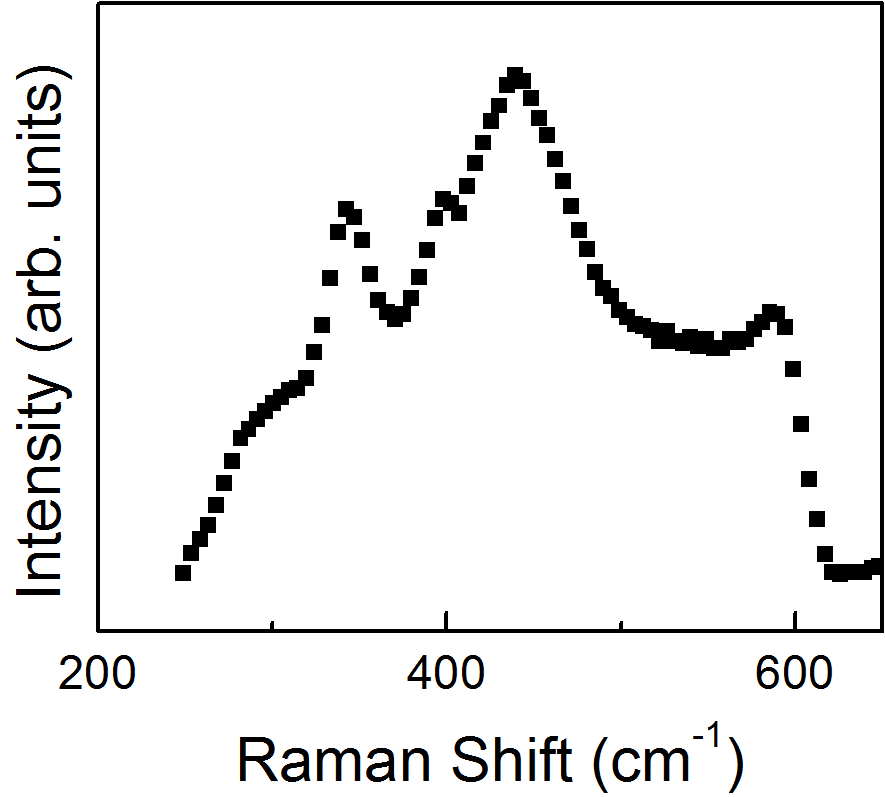 The Raman spectrum is an important and useful tool to investigate the optical, vibrational properties of materials and to identify the crystallization, structural disorder, and material defects. According to group theory, the optical phonons at the Γ point of Brillouin zone are 1A1+2B1+1E1+2E2 for hexagonal wurtzite zinc oxide. Among them, both A1 and E1 models are polar and split into transverse (TO) and longitudinal optical (LO) photons, all being Raman and infrared active. The two nonpolar E2 modes are Raman active only and the two B1 modes are infrared. Furthermore, nonpolar E2 photon modes have two frequencies. The low-frequency E2 mode (E2 low) is associated with vibration of zinc (Zn) sublattice. Whereas the high-frequency E2 mode (E2 high) is related to the vibration of oxygen atoms [17-19]. The frequencies of the fundamental optical modes in zinc oxide reported in the literature [20] are: E2 low = 101 cm-1, E2 high = 437 cm-1, A1 (TO)= 380 cm-1, A1 (LO)= 574 cm-1, E1 (TO)= 407 cm-1, E1 (LO)= 583 cm-1, E2 high-E2 low = 333 cm-1. The observed room temperature Raman spectrum of as-prepared zinc oxide nanoparticles using parthenium plant extract exhibits multiple prominent peaks in addition to weak and broad peaks as showed in fig. 4. The observed spectrum shows an intense peak at 439 cm-1, which corresponds to the Raman active E2 (high) mode of the wurtzite zinc oxide crystal. It is red shifted of ~2 cm-1 as compared with the bulk zinc oxide. The second significant Raman active peak at 342 cm-1 could be assigned to the second order Raman spectrum arising from zone-boundary phonons E2 high-E2 low, while the small peak at 398 cm-1 corresponds to A1 (TO) phonon modes and found to be redshifted at 18 cm-1. The small peak at 589 cm-1 is contributed by the E1 (LO) mode of as-prepared zinc oxide nanoparticles using parthenium plant extract associated with the formation of defects such as oxygen vacancies or other defect states. The observed intense E2 (high) mode and suppressed E1 (LO) mode indicates that the as-prepared zinc oxide nanoparticles using parthenium plant extracts possess crystalline nature with hexagonal wurtzite structure, which further testifies the results of XRD pattern.