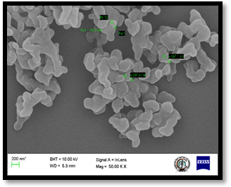 Surface morphology and particle size measurement of the nanoparticles was determined by scanning electron microscopy (SEM) (Zeiss Ultra 55, Germany) [17-24]. In the analysis, the samples were firstly attached to a small piece of the electro-conductive silicon chip; then gold sputtered using a vacuum gold sputter coater.