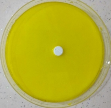 The wetting time was measured using a simple procedure in which five circular tissue papers of 10 cm in diameter were placed in a 10 cm circular petri dish. 10 ml solution of a water-soluble dye (0.02% tartrazine dye) was added. A tablet was carefully placed on the surface of the tissue paper, the time spent for water to reach the upper surface of the tablet represents the wetting time [16].
