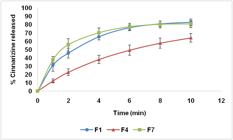 Fig. 7: Percentage release of cinnarizine from ODTs prepared with different types of super disintegrants and lactose diluent. n=6; Data are expressed as mean±SD