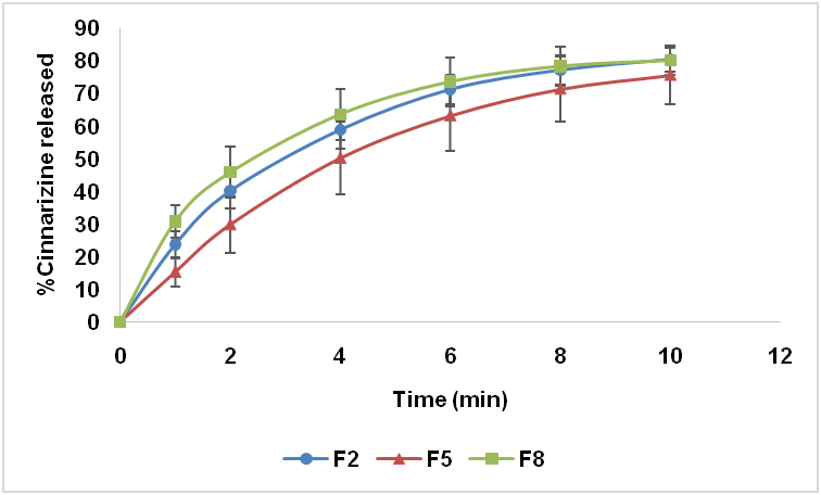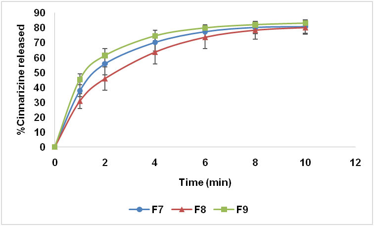 By increasing the percentage of Kyron-T314 from 5% in the formula, F9 to 8% in the formula F9c the percentage of the drug release dafter 2 min increased from 61.46±4.60 to 74.55±3.0 (fig. 8), (ANOVA, **P<0.01). These results were much higher than that of the commercially available cinnarizine tablets (Stugeron® 25 mg tablet), in which only 8.75±2.15% of the drug was released within 2 min.