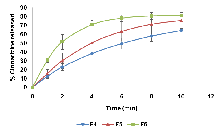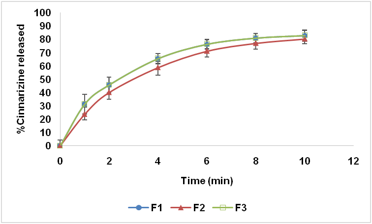 From each formula of the prepared cinnarizine ODTs, 10 tablets were randomly selected and powdered. An equivalent amount of 25 mg of cinnarizine was taken and dissolved in 0.1 N HCl, filtered and analyzed for drug content at the ƛ max (254) by UV-visible spectrophotometer [17].