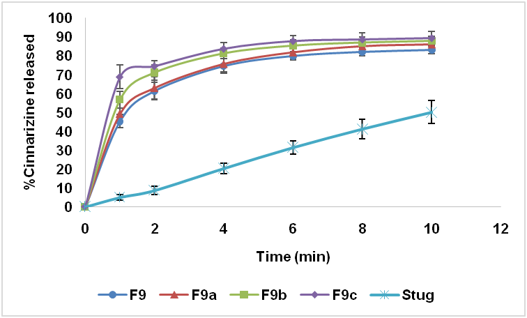Fig. 8: Percentage release of cinnarizine from ODTs (F9, F9a, F9b, F9c), prepared with a different concentration of the super disintegrant (Kyron T-314), and from the marketed product, Stugeron® 25 mg. n=6; Data are expressed as mean±SD
