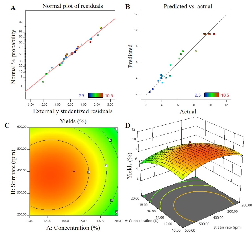 Fig. 1: Model analysis results for response yields (Y1), normal plot of residuals curves (A), prediction vs. actual curves (B), contour plots (C), and 3D surface plots (D)